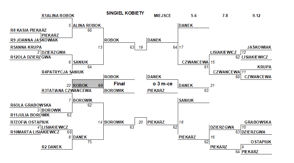 Wśród pań po raz kolejny klasę pokazała Alina Robok, która obroniła tytuł Mistrzyni Polski z 2023 roku! Tuż za nią, na drugim miejscu, uplasowała się młoda i niezwykle utalentowana juniorka z Dąbrowy Górniczej, Julia Borowik, co jest fantastycznym prognostykiem na przyszłość. Brązowy medal zawisł na szyi Natalii Danek z Wrocławia, która w decydującym meczu pokonała Kasię Piekarz z Gorzowa Wielkopolskiego.