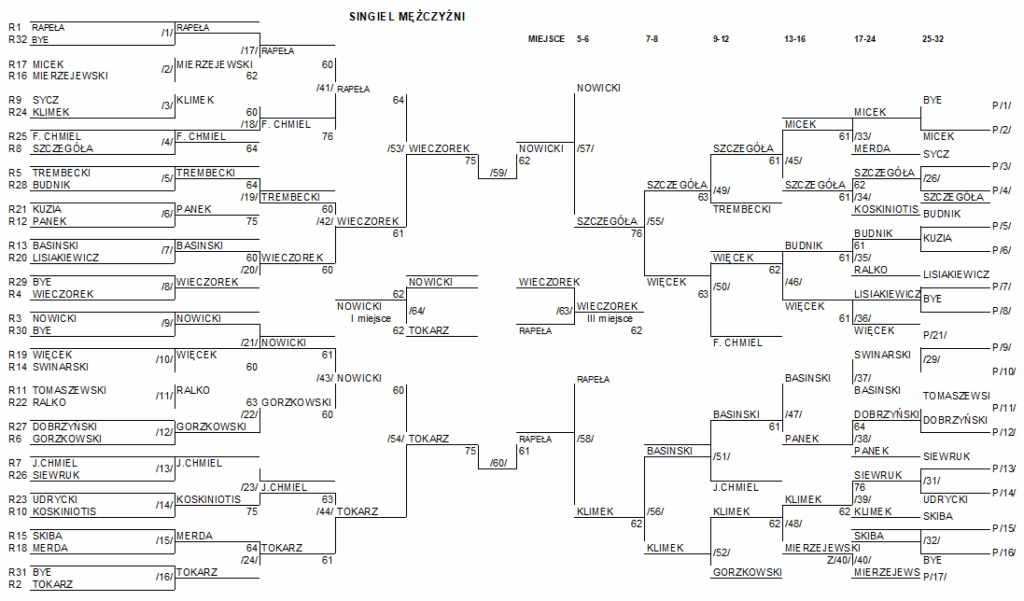 W turnieju mężczyzn byliśmy świadkami potwierdzenia dominacji czołówki. Ostatecznie w wielkim finale Maciej Nowicki pokonał Jakuba Tokarza, sięgając po tytuł Mistrza Polski. Niezwykle zacięty był mecz o brązowy medal, w którym Antek Wieczorek zwyciężył z ubiegłorocznym mistrzem, Adamem Rapełą, zapewniając sobie miejsce na podium.